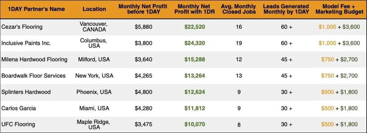 View real-world examples of successful 1 DAY® Partners across North America who’ve implemented the 1 DAY® Refinishing Model and turned their local markets into thriving, high-margin businesses. See how our model empowers entrepreneurs, generates significant cash flow, and delivers exceptional results. Ready to see what’s possible? Take a look at real data from our recent partners who have transformed their businesses with the 1 DAY® Refinishing Model.